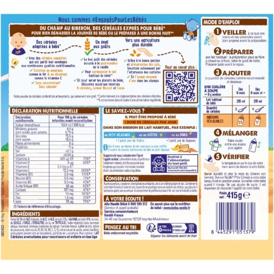 Découvrez P'TITE CEREALE saveur Vanille dès 6 mois. Conçues exprès pour bébé*, avec des céréales complètes qui ont gardé leur enveloppe aux nombreuses qualités nutritionnelles, et enrichies en minéraux et en vitamines, pour agrémenter le lait habituel de bébé**, pour bien démarrer la journée de bébé ou le préparer à une bonne nuit**. Veillez à respecter l'appétit de votre bébé. *Conformément à la réglementation sur les céréales infantiles. **A consommer dans le cadre d'une alimentation équilibrée.